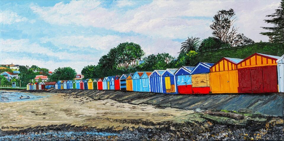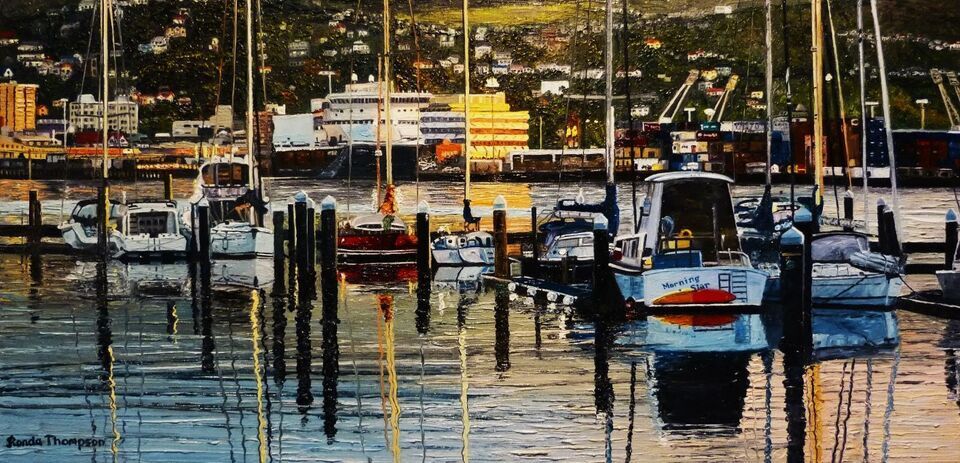 Ronda Thompson - From her seaside home in Pukerua Bay Ronda paints in oil using a combination of brush and palette knife. Combined with her love of detail and often using the early morning or evening light she gives her cityscapes a unique mix of texture, warm dramatic light and complex scenery. From left to right Calm Morning at Chaffers Marina' 'Titahi Bay Boatsheds' and 'Lampstands'