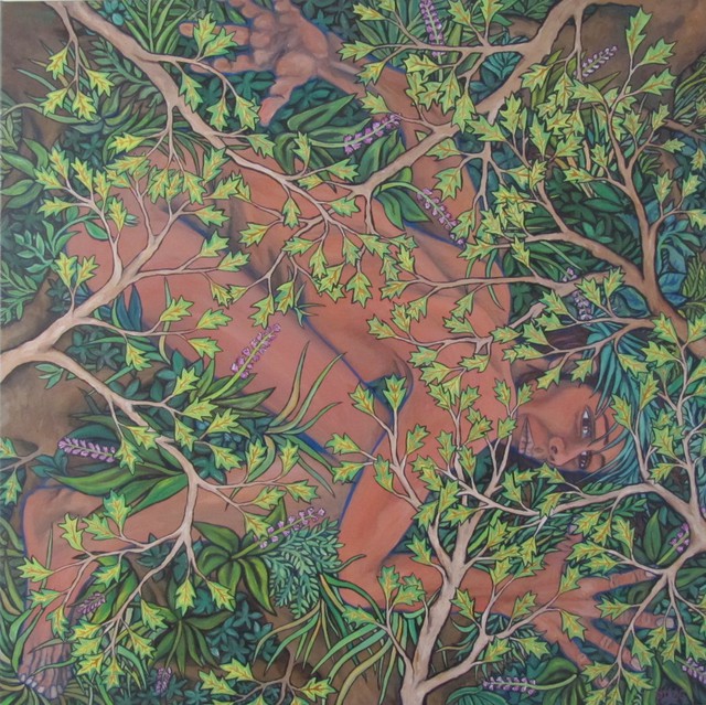 This painting can be displayed from three different perspectives. The figure positioned sideways, upright or the canvas hung like a diamond.