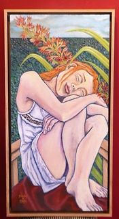 acrylic on jute size 385mm x 760mm with wood recess frame