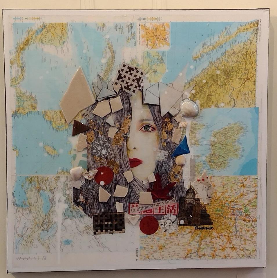 mixed media collage with resin coat finish, size 750mm x 750mm
